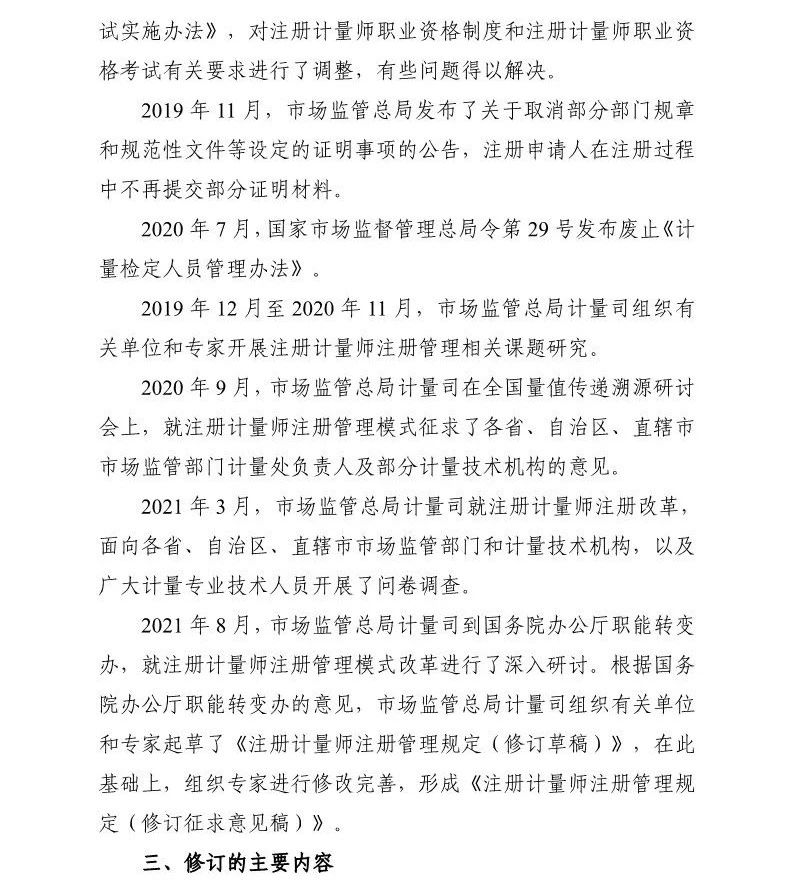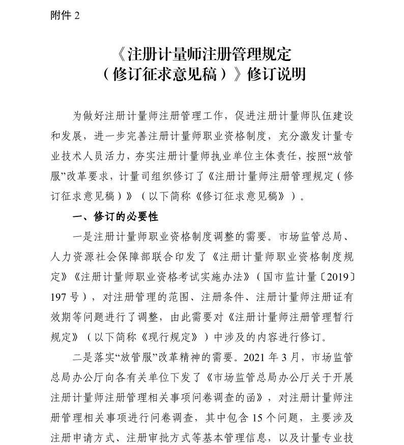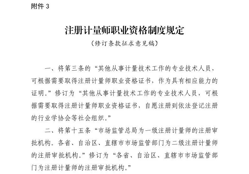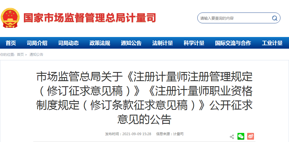 近日,国家市场监督管理总局计量司发布了关于《注册计量师注册管理规定(修订征求意见稿)》《注册计量师职业资格制度规定(修订条款征求意见稿)》公开征求意见的公告,并发布了相关征求意见稿及修订说明(见附件)。公告内容如下: